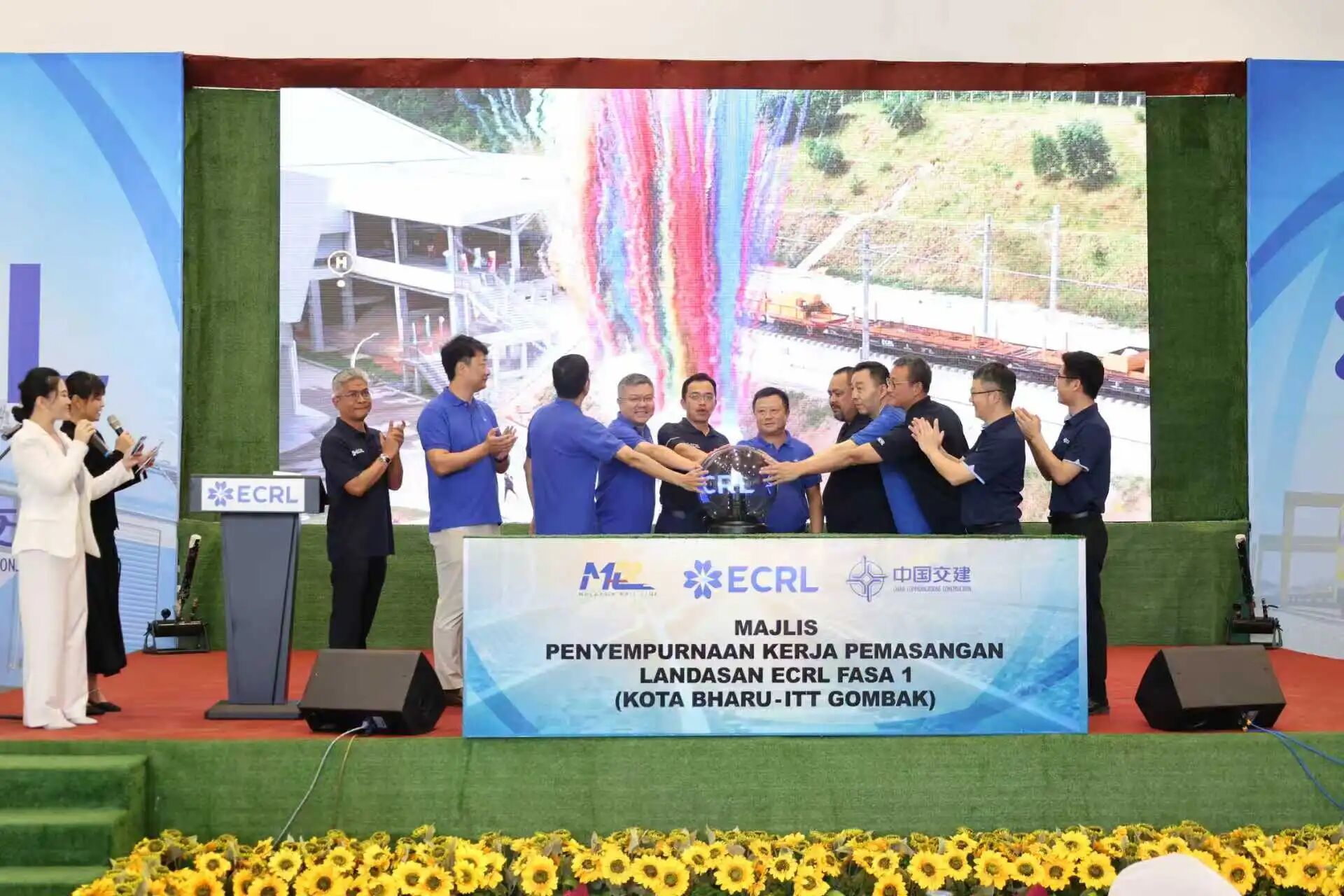 马来西亚东海岸铁路项目在鹅唛车站铺轨工程现场举行一期工程(哥打巴鲁至鹅唛)全线轨道铺通仪式。马来西亚铁路衔接公司首席执行官拿督斯里达维斯出席仪式并致辞。