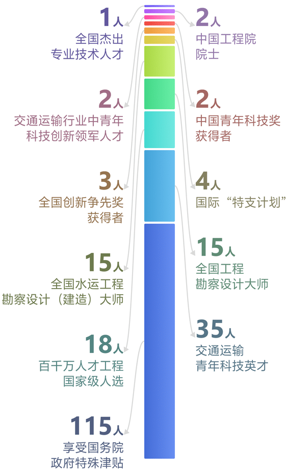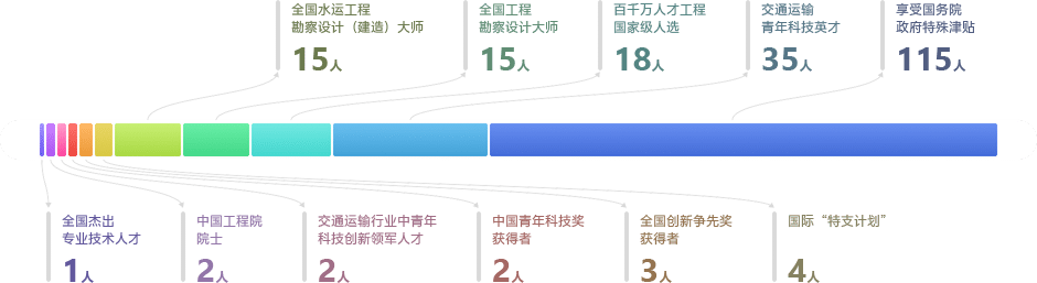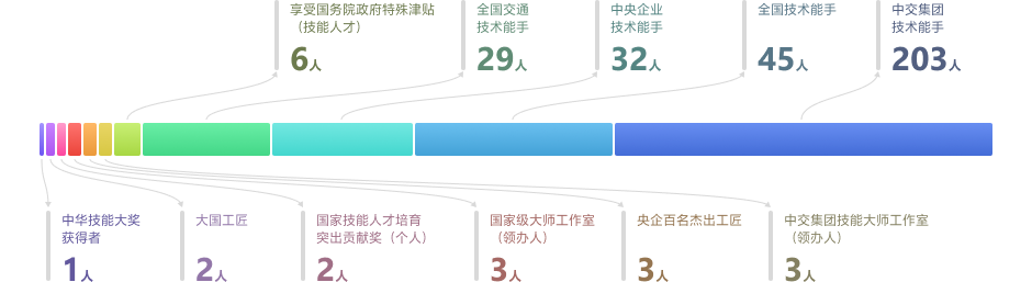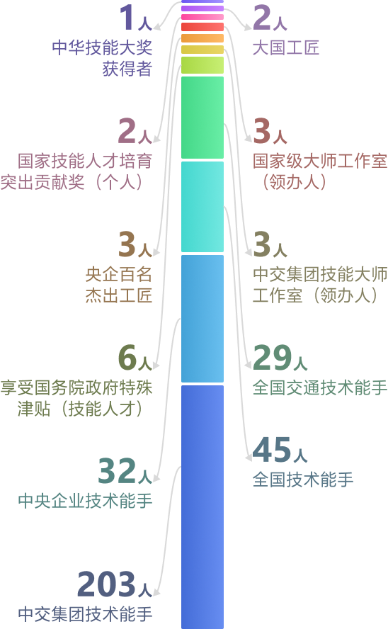 公司现有中华技能大奖获得者1人、大国工匠2人、全国技术能手45人、国家技能人才培育突出贡献奖(个人)2人、享受国务院政府特殊津贴(技能人才)6人、国家级大师工作室(领办人)3个、央企百名杰出工匠3人、中央企业技术能手32人、全国交通技术能手29人、彩票计划