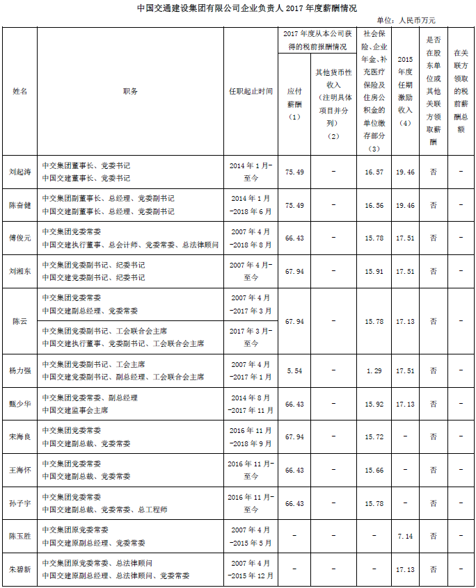 按照深化国有企业负责人薪酬制度改革的有关要求和国资委相关规定,现将中国交通建设集团有限公司企业负责人2017年度薪酬信息披露如下: