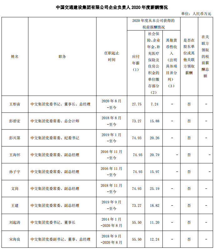 关于披露中国交通建设集团有限公司企业负责人2020年薪酬情况的公告