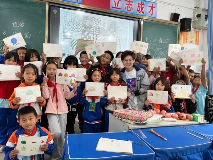 助梦·教育提升”支教活动中,一名志愿者来带云南福贡为一所小学孩子们教授美术课,通过一系列生动有趣、富有启发性的课程活动向学生展示一个丰富多彩的艺术世界,挖掘他们的想象力和创造力,