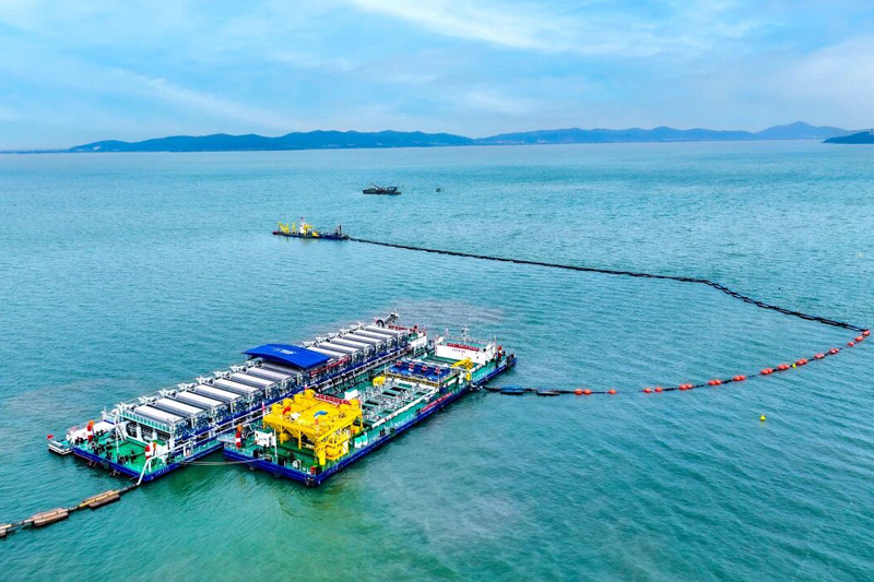 国内首制、世界最大舱容LNG清洁能源动力耙吸挖泥船,船长151.7米,泥舱最大舱容达16808立方米,采用LNG与柴油双燃料动力系统,配置1580立方米LNG双耳罐,年疏浚能力达1600万立方米。该船首次使用LNG燃料和先进的综合智能管理平台,达到IMO Tier Ⅲ排放标准,全生命周期可减少碳排量约41.69万吨,形成了多项核心专利,入选彩票计划 “绿色低碳专项方案”“上海港航绿色发展应用案例”,为LNG动力在疏浚行业的规模化应用奠定基础。“新海鲟”轮的投产填补了国内清洁能源在疏浚行业应用的空白,为国内疏浚行业绿色发展树立标杆,推动了我国绿色疏浚装备的技术升级。